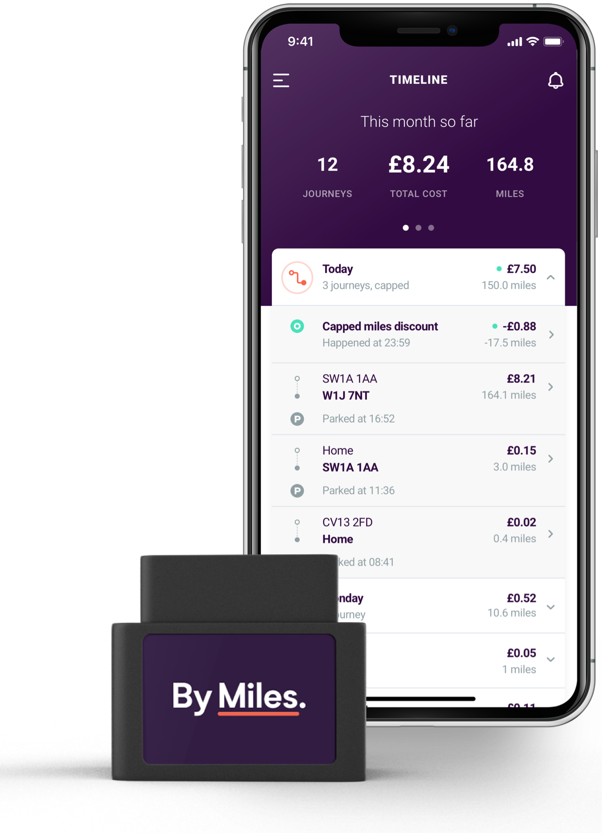 Use the By Miles smartphone app or log into our web dashboard at dashboard.bymiles.co.uk. Depending on whether you've got a policy with a Miles Tracker or a totally trackerless one (for your connected car) you'll automatically be able to see your individual journey costs or daily mileage, and access handy tools and control free reminders for things like your MOT or car tax.